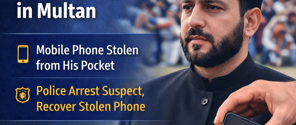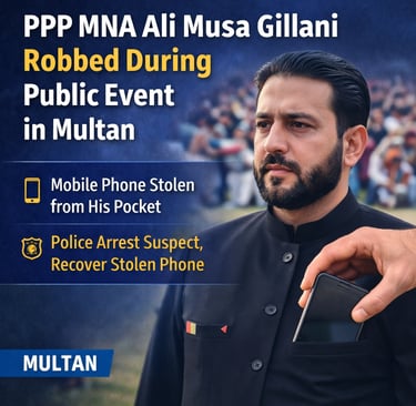 PPP MNA Syed Ali Musa Gillani’s mobile phone was stolen during a public event in Multan. Police registered a case, arrested the suspect, and recovered the stolen phone.